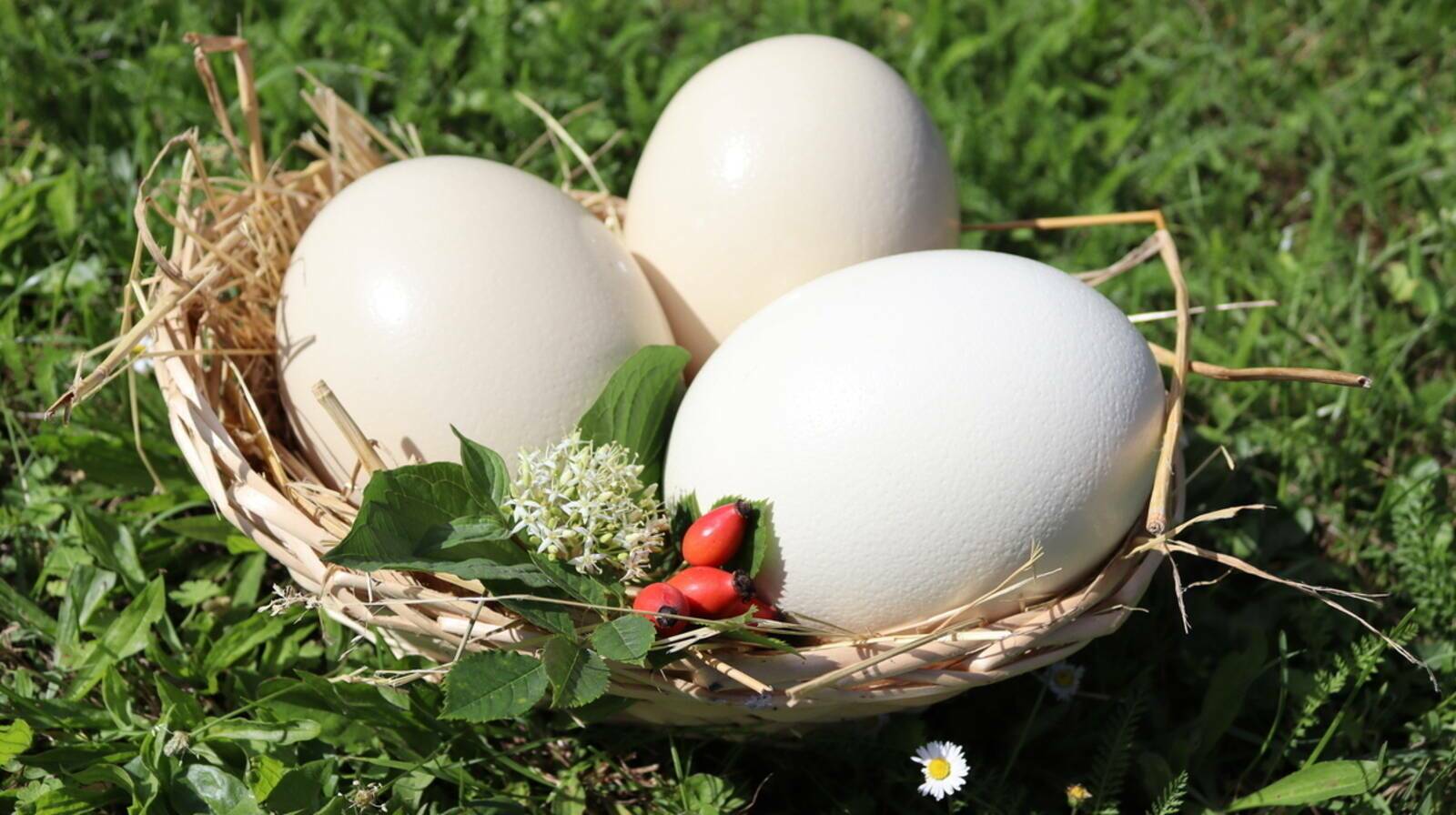 Die Eier stammen von unsere Straußen, die ganzjährig im Freiland, auf einer großen Weidefläche mit Unterstand leben.